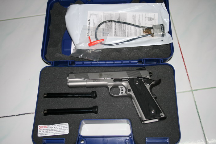 หลังจากที่ได้ป.3เมื่อวันจันทร์ที่ผ่านมา(20เมย.51)วันนี้เจ้าSmith SW1911 .45ACPก็มาอยู่ในมือผมเป็นที่เรียบร้อบแล้วคับ ฮึ่ม ที้ละครับ โจรก้อโจรเถอะเข้าบ้านมาอีกที เจอทั้งGLOCK 19ของภรรยา..(ที่เคารพ)..แล้วก้อเจ้านี่ละครับ อิอิ ยังงัยก้อเข้ามาติชมได้นะครับ ภาพแรกนี่เป็นสภาพกล่องครับ จะเป็นสีฟ้า มีข้อความSmith&Wesson สลักเป็นตัวนูนๆไว้อ่ะครับ