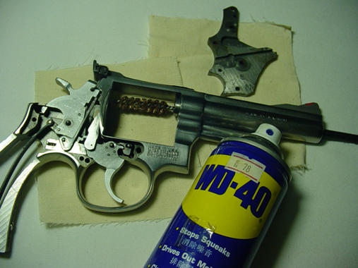 คือคำว่าเช็ดให้แห้งนี่ ไม่ใช่หมายความว่าเช็ด ถูจนคราบน้ำมันที่อยู่ในลำกล้องแห้งหมดไปเลยอย่างที่ว่านะครับ เอาแค่เพียงชโลมน้ำมันยี่ห้ออะไรก็ได้ที่มีคุณสมบัติในการป้องกันสนิม/ความชื้น (ของผมใช้ WD-40) แล้วใช้ผ้าแห้งเช็ดให้น้ำมันเหลือแค่หมาดๆบางๆ เคลือบผิวเหล็กของลำกล้องและผิวปืนด้านนอก ทั้งนี้เพื่อป้องกันไม่ให้เนื้อเหล็กทำปฏิกิริยากับอ็อกซิเจน(ว่าเข้านั่น)ซึ่งจะทำให้เกิดสนิม