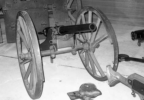 เอ...จำไม่ได้ ไม่ทราบว่ามีการลงภาพหรือกล่าวถึงหรือยัง เคยเห็นในหนังดาวบอย เป็นปืนกลหลายลำกล้อง เวลายิงต้องใช้มือหมุนลำกล้องเอง