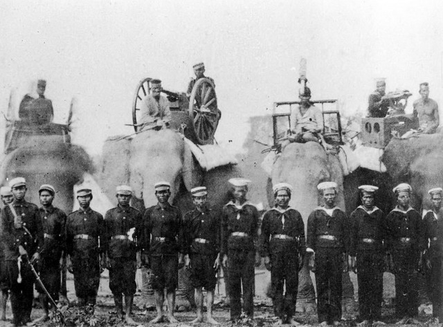 ภาพทหารสมัย ร.5 ที่เรายกทัพไปปราบพวกฮ่อที่แคว้นหลวงพระบาง เมื่อปีพ.ศ. 2428 ขวามือสุดคือปืนกลกัตลิ่งติดตั้งบนหลังช้างครับ