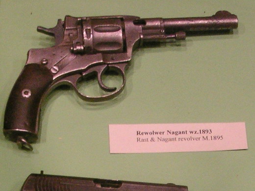 ปืนพก Nagant M1895 ใช้กระสุน 7.62x38 mm. R (7.62 Nagant) ระบบปฏิบัติการแบบ Double action ระยะหวังผล 25 หลา ความจุ 7 นัด
