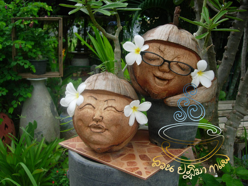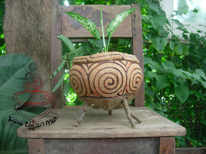 ผลงานเป็นกระถางแขวน และปลูกต้นไม้ด้านหลัง เป็นงานประติมากรรมตกแต่งจัดสวน