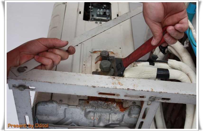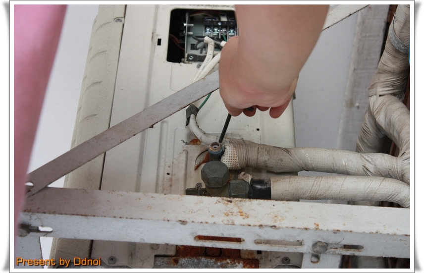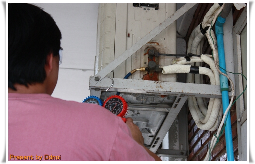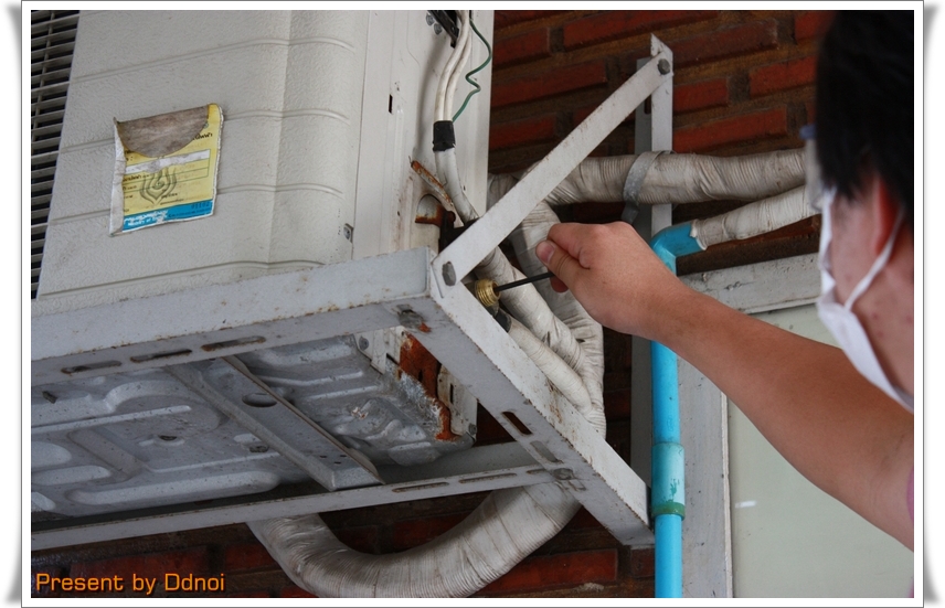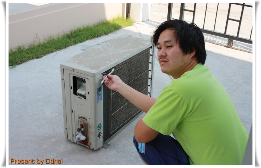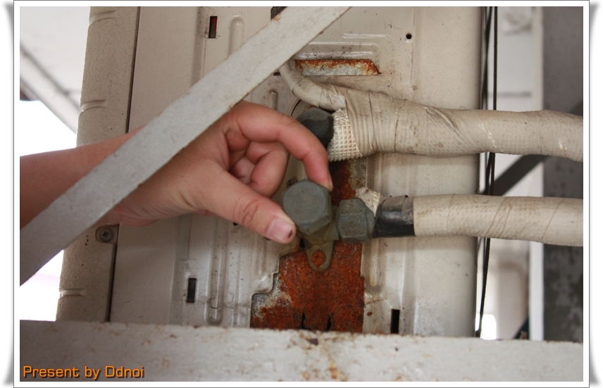 เอา ประแจ หก เหลี่ยม มา ใส่ แล้วก็ หมุนเข้าไป... (น่าจะหมุนเข้าเพื่อเปิดรูไม่ให้น้ำยาแอร์ออกจากตู้ ล่ะมั๊ง)