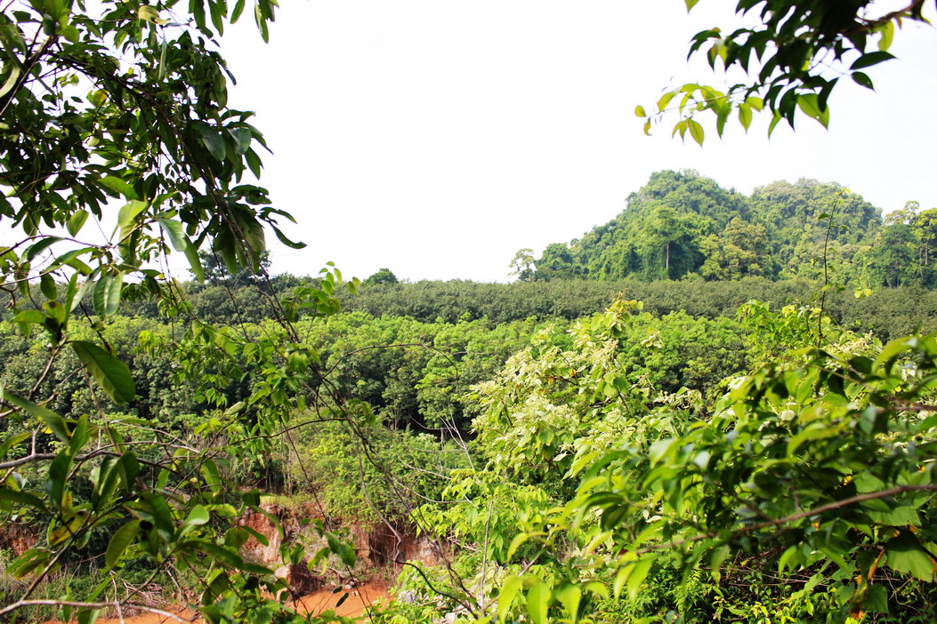 เขาหินร่วน สูงระดับยอดยาง สิบกว่าเมตร ที่ซีกด้านหนึ่งของเขา เขาถือกรรมสิทธิ ขุดขายหินไปหมดแล้ว ของเราสงวนป่าใว้