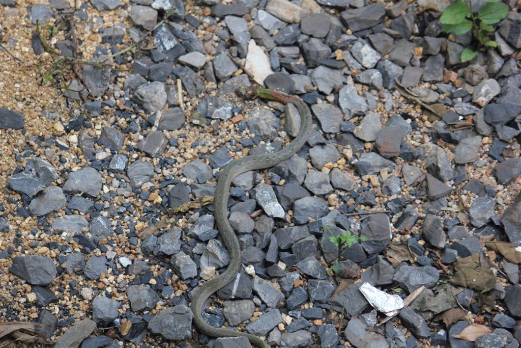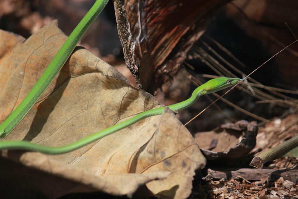 วันนี้ ประเดิมด้วยงูเขียวหางใหม้ คืบ ๆคลาน ๆอยู่บนใบสักร่วงแห้ง ตอนลงไปกินข้าวเที่ยงระเบียงหน้าบ้าน กิน ๆข้าวอยู่สายตาสอดส่ายไปเห็นพอดี