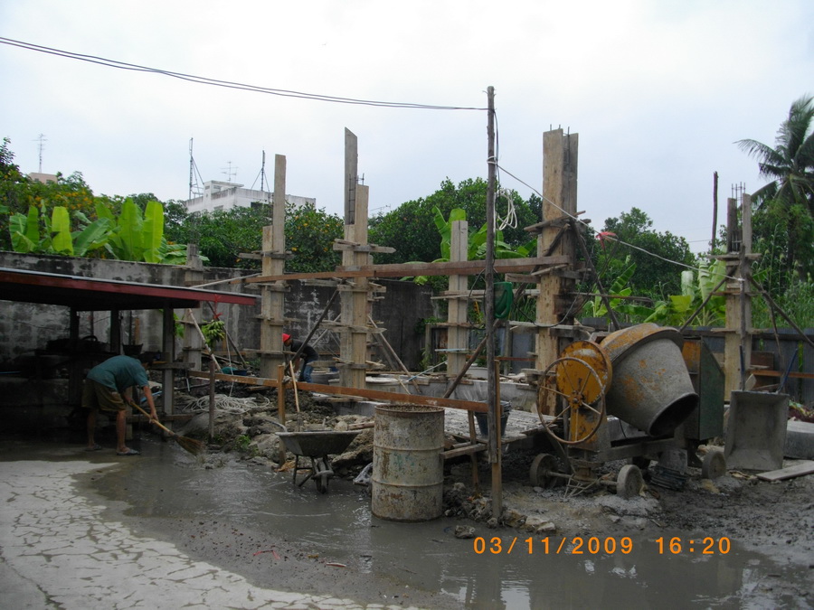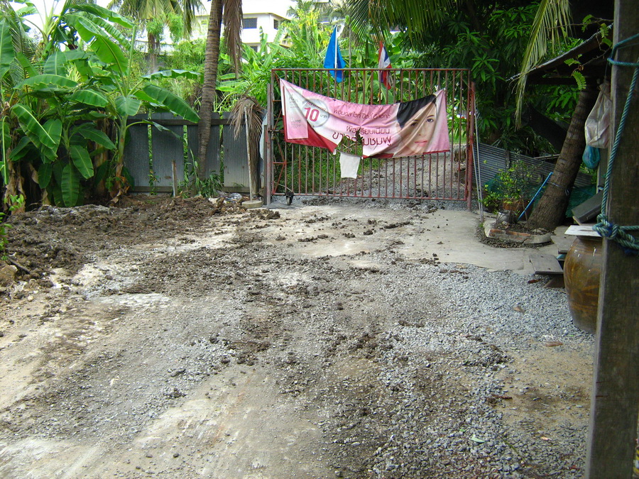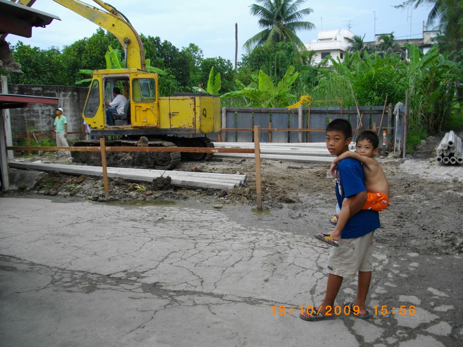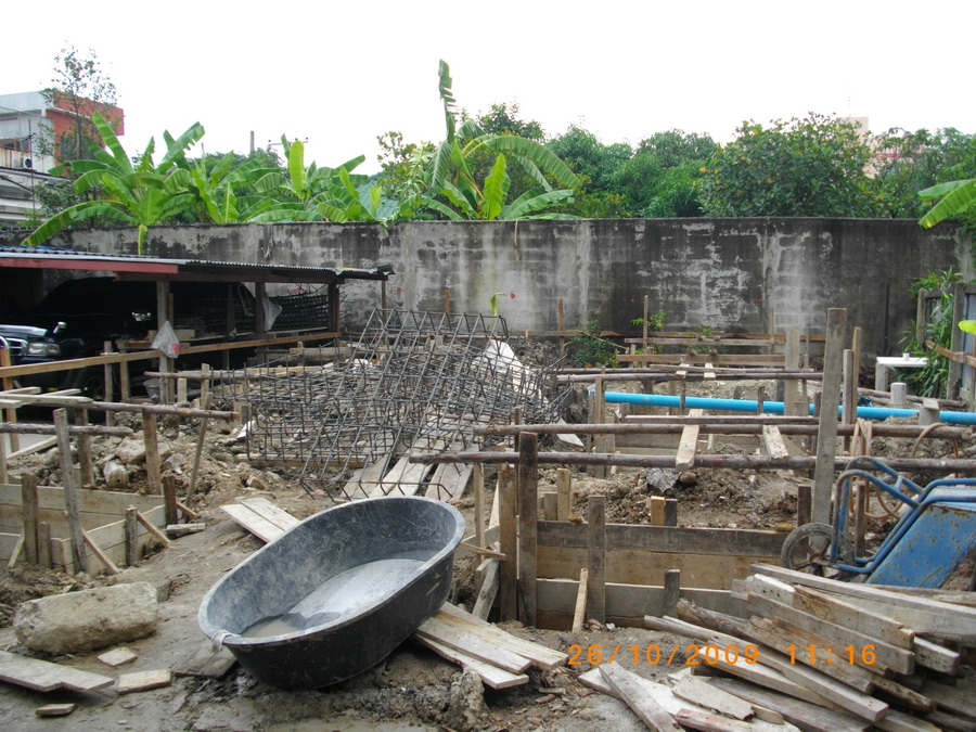 หลังจากถมเสร็จก็ยังไม่ได้ทำอะไรต่อเพราะเงินยังไม่พร้อม ทุกเย็นผมได้แต่ยกเก้าอี้มานั่งเล่นกับลูกตรงแปลงนั้นแล้วก็นั่งคิดฝันถึงบ้านทุกวัน
