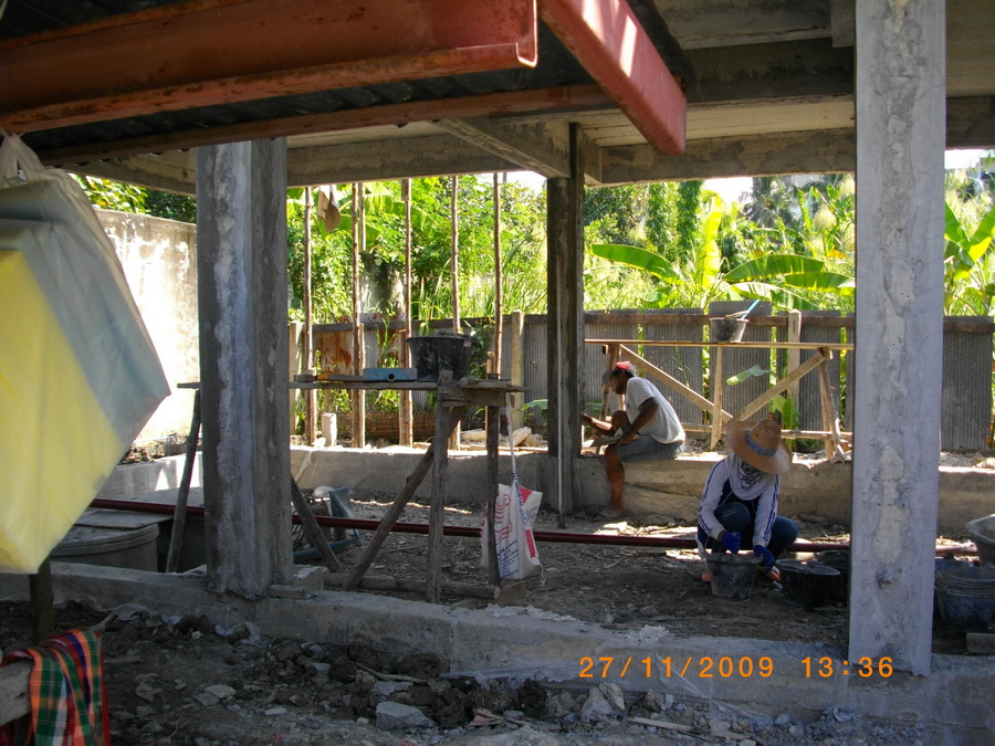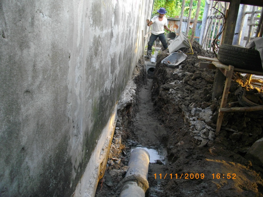ข้างบนยังทำอะไรต่อไม่ได้ เราหันมาทำข้างล่างก่อน ขุดแนวท่อระบายน้ำ