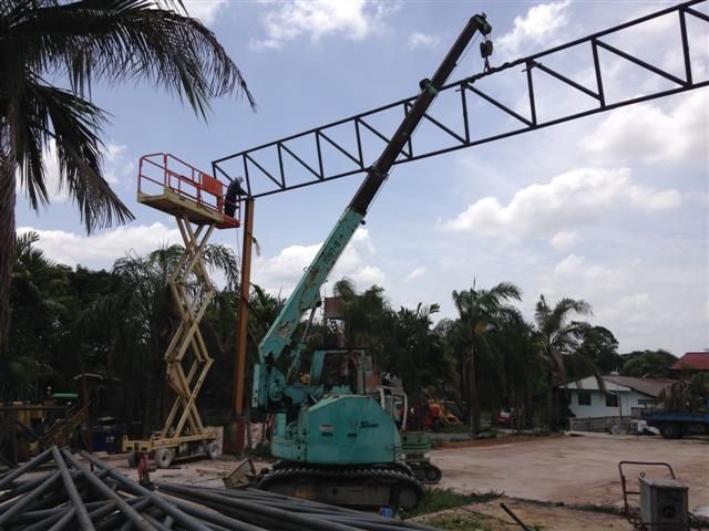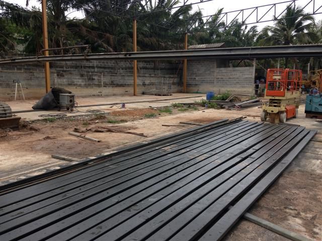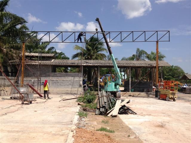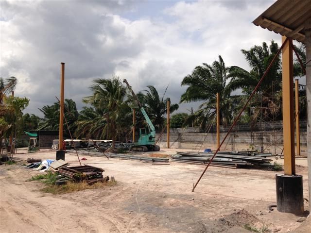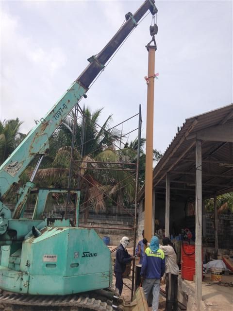 เทคอนกรีต ในแบบเสา เสร็จ บ่มคอนกรีตทิ้งไว้ 3วัน แล้วตั้งเสาบีมต่อเลย........พระเอกสำหรับงานนี้ รถเครน ตีนตะขาบ ยกเสา บีมตั้งบนเพลท พร้อมอ็อกเชื่อมติดกับ เสาตอหม้อ