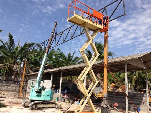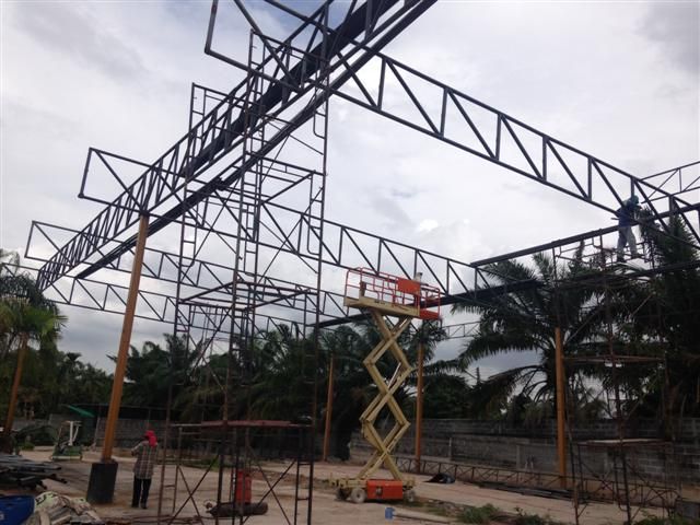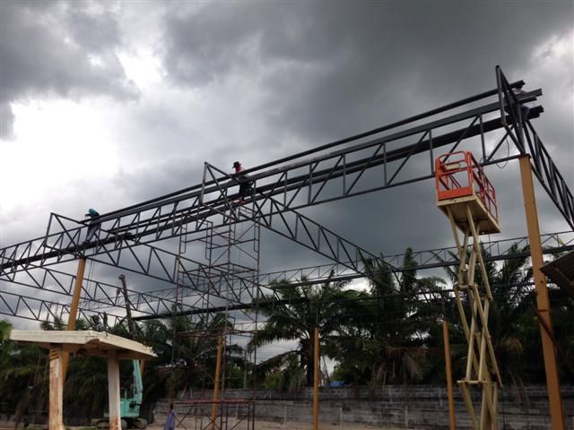 ช่างขึ้นรถกระเช้าไฟฟ้า ...เชื่อมยึดหัวเสากับจั่ว