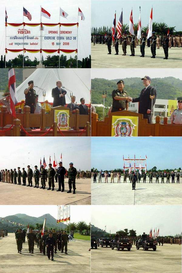เมื่อ 15 พ.ค.49 เวลา 09.00 น. พล.อ.เรืองโรจน์ มหาศรานนท์ ผบ.ทหารสูงสุด ร่วมกับ H.E.Mr.Ralph Boyce,Jr เอกอัครราชทูตสหรัฐ/ไทย H.E. Chan Heng Wing เอกอัครราชทูตสิงคโปร์/ไทย H.E.Mr. Atsushi Tokinoye เอกอัครราชทูตญี่ปุ่น/ไทย และ H.E. Mr.Ierahim Vusus เอกอัครราชทูตอินโดนีเซีย/ไทย เป็นประธานร่วมในพิธีเปิดการฝึกร่วมภายใต้รหัส "คอบร้าโกลด์ 06" ระหว่างกองทัพไทย สหรัฐ ฯ สิงคโปร์ ญี่ปุ่น และอินโดนีเซีย ประจำปี 2549 ณ โรงเรียนเตรียมทหาร อ.บ้านนา จ.นครนายก การฝึกครั้งนี้มีขึ้นระหว่าง 15 - 26 พ.ค.49 และมีประเทศร่วมสังเกตการณ์การฝึก 9 ประเทศได้แก่ เวียดนาม สหรัฐอาหรับเอมิเรตส์ ออสเตรเลีย ฝรั่งเศส เกาหลีใต้ จีน มาเลเซีย เยอรมนี และนิวซีแลนด์