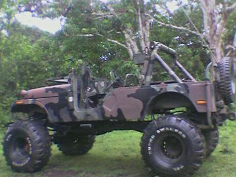 cj-6 ใส่ยาง 38.5 กระทะล้อผ่าเป็น 11.5 นิ้ว วางเครื่องยนต์ใหม่เป็น ND27Turbo กลับแหนบยกเพิ่มอีก 4 นิ้ว สีลายพรางทหาร แต่งแต้มด้วยพู่กัน