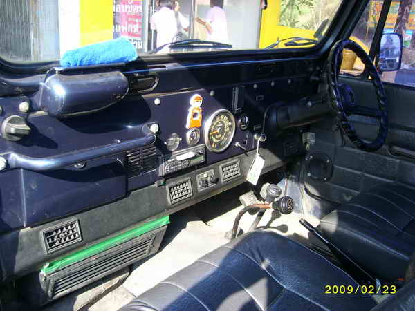 ตอนที่ได้มาคันนี้ไม่ค่อยมีอะไรที่เป็นของเดิมเป็นชิ้นเป็นอันครับ อะไหล่หาใหม่ รวบรวมมาจากทั่วทุกสารทิศ ลงมือเองก็เยอะ จ้างเขาทำก็มาก แต่โดยรวมแล้ว 70-80 % ได้อย่างที่ตั้งใจไว้ สีออกจะเพี้ยนไปหน่อยจากที่คิดไว้ว่าจะให้ออกมาในแนวของเหลืองทหาร ทรายด้าน กลายมาเป็นคล้ายๆกับของรถแลนด์ไปซะนี่ และก็ยางบั้ง 700 เส้นเล็กไปนิดนึงเมื่อเทียบกับขนาด BODY ของ CJ 6 ตัวถังยาว