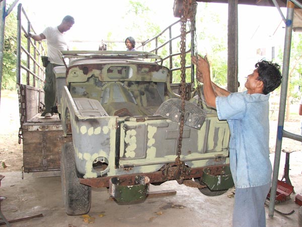 ลองใช้หกล้อหรือสี่ล้อกลางคันใหญ่ๆ ที่เปิดกะบะข้างได้ขับไปที่อู่ที่มีลีฟท์ยกจี๊ปขึ้น แล้วถอยรถบรรทุกเข้าไปรับ ล๊อคให้แน่นหนาแล้ววิ่งยาว 120 ก็ยังใหว อีกวิธีหนึ่งคือใช้รถสไลส์ (เคยบรรทุกจากอุบลเข้ากทม.)