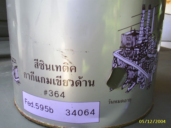 ลองดูของยี่ห้อนี้ซิครับ น่าจะพอได้เป็นสีที่ใช้ในทางราชการ : Thai Kansai Paint (หรือสีตราพัด) เบอร์ 36-25356 green olive drab "non-enamel"