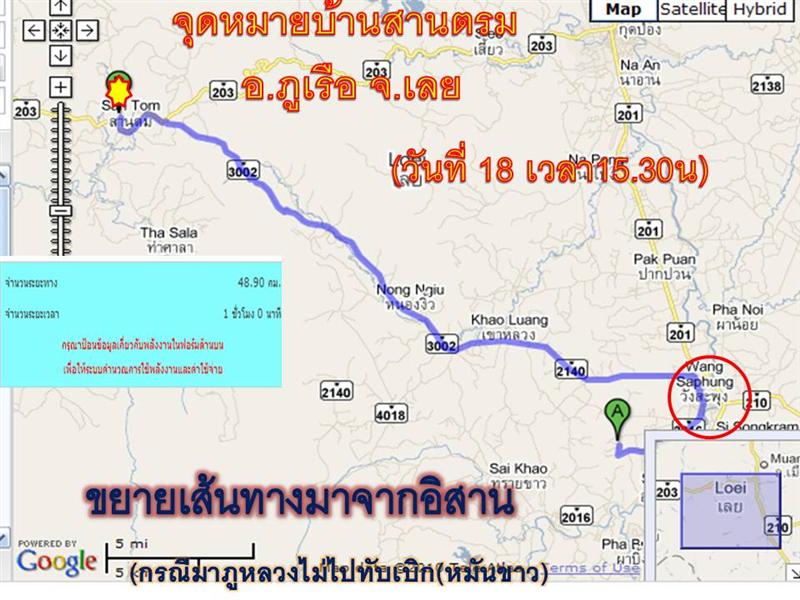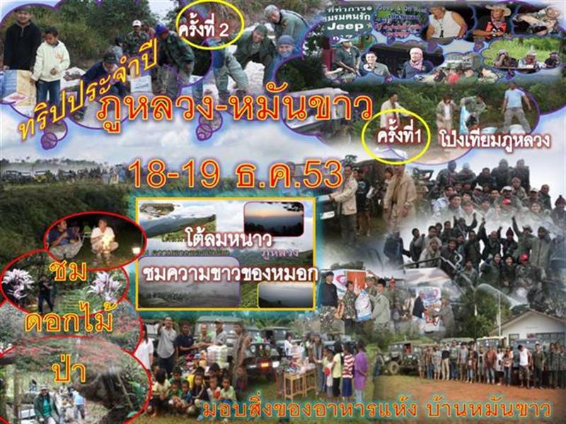 วันที่ 18 รวมพลที่ สี่แยกหล่มสัก(ลานพ่อขุนผาเมือง) เวลา 08.30 น.แล้วเดินทางต่อไปที่ ทับเบิก-หมันขาว(ห่างกันไม่เกิน 10 กม.) ร่วมทำกิจกรรมบำเพ็ญประโยชน์มอบของใช้ อาหารแห้ง (ทำกิจกรรม เสร็จก่อน 13.00น.) โดยใช้เส้นทางผ่านไร่เกษตรชาวม่งและ ผ่านป่า แถวๆริมขอบอช.ภูหินร่องกล้า-ออกบ้านน้ำพุง(รวมระยะทาง 30 กม.-เดินทางต่อตามถนนหลัก(อีกประมาณ 70กม.ถึงบ้านสานตรม อ.ภูเรือ จ.เลย(ทางแยกขึ้นภูหลวง)เวลา 15.30น. พบกับกลุ่มที่ไม่มาทับเบิก รวมขึ้นภูหลวง โต้ลมหนาว ชมความขาวของหมอกพัก 1 คืน