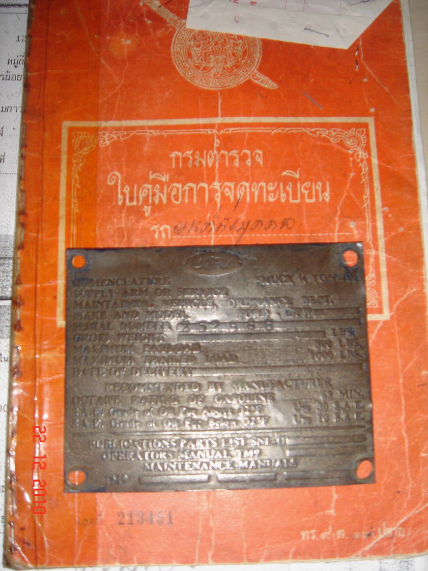 ผมขอแสดงความยินดีด้วยครับคุณเจมส์ที่ไปต่อทะเบียนได้สำเร็จคงใช้เวลาและหมดตังไปเป็นหมื่นเพราะรถทะเบียนขาดเกิน4ปีแล้วคันนี้ เจอคุณเจมส์ครั้งสุดท้ายที่เกษตรตอนน้ำท่วม แล้วไม่เจอกันอีกเลย เชื่อเปล่าว่าผมไม่เห็นกระทู่นี้เลยดูแต่กระทู้แลนด์ เพิ่งมาเห็นก็เกือบปีพอดีที่คุณเจมส์โพร์สไว้ เวลามันไปไว้จริง รถคันนี้คงเป็นคูบารมีกับคุณเจมส์จริงๆ จอดนิ่งซุกพงหญ้าใต้ต้นปาล์มอยู่ริมถนนเแถวบ้าน เส้นอ.ดอนตูม เห็นมาเป็นปีรอดตามาไงไม่รู้ ไม่เคยเข้าไปถามหรือดูเลยจนรู้จัก กับคุณเจมส์เซียนจีฟที่เก็บข้อมูลจากเน็ทมาแบ่งปันความรู้กัน จึงพาคุณเจมส์ไปดูกันว่ามันเป็นรถรุ่นไหนทำมัยมันยาวจัง จึงรู้ว่าเป็๋น ford GPW ที่ตัดขยายคัชซีก็ไม่ได้ติดตามอะไรจนช่างทำจีฟที่บ้านเขามาบอกว่าเขาขายมีทะเบียนด้วย ก็ไปดูแล้วก็เห็นว่าทะเบียนเป็น ISUZU แต่เลขตัวรถตรงกับ GPW 252888 ที่ติดอยู่กัน คัชซีท่อนหน้าด้ายซ้าย แถมเผ่นเพลท ทองเหลืองก็ตรงกันอีกด้วย ก็เลยเสี่ยงซื้อเก็บไว้ในราคา 55,000 บาท โดยตอนนั้นไม่มีเงินสดนะยืมตังน้ามาด้วย ทุนหมุนหมดเพราะกำลังทำรถไว้หลายคัน กะว่าซื้อเก็บไว้ก่อน เดี๋ยวหลุด โดนดอกร้อยละห้าด้วยนะ พอดีช่างไม่ทำรถให้แล้วไปทำที่อื่นก็เลยจอดนิ่งสนิทอยู่หลายเดือนทั้งหมด สุดท้ายบอกขายในกระทู่ไม่มีใครเอา เลยบอกให้คุณเจมส์มาเอาในราคามิตรภาพ ก็เพราะผมรีบจะเอาตังไปคืนน้าแล้ว ที่เล่ามานี้ก็เป็นข้อสังเกตว่าคนเราจะได้อะไรมานั้นจริงๆแล้วมันเป็นวาสนาของของเขาเองครับ ของของเขาก็ต้องไปอยู่กับเขาครับ ผมเป็นแค่ช่างที่ปรารถนาจะอนุรักษ์ยนต์กรรมที่กำลังจะถูกทำลายกายเป็นเศษเหล็กเข้าโรงหล่อเท่านั้นเอง และถ้าเพื่อนๆสนใจทีจะทำรถก็ติดต่อมาได้นะครับเพราะช่างจีฟมาอยู่กับผมอีกครั้งแล้วครับ รับงานทีละคัน ปีนึงคงทำได้ไม่เกิน 4 คัน เพราะผมทำเป็นงานอดิเรกไม่ได้ทำเป็นอาชีพครับ ขอบคุณครับ