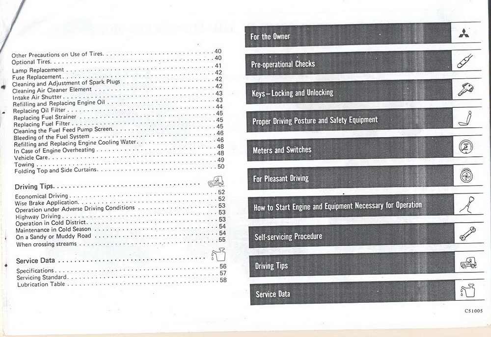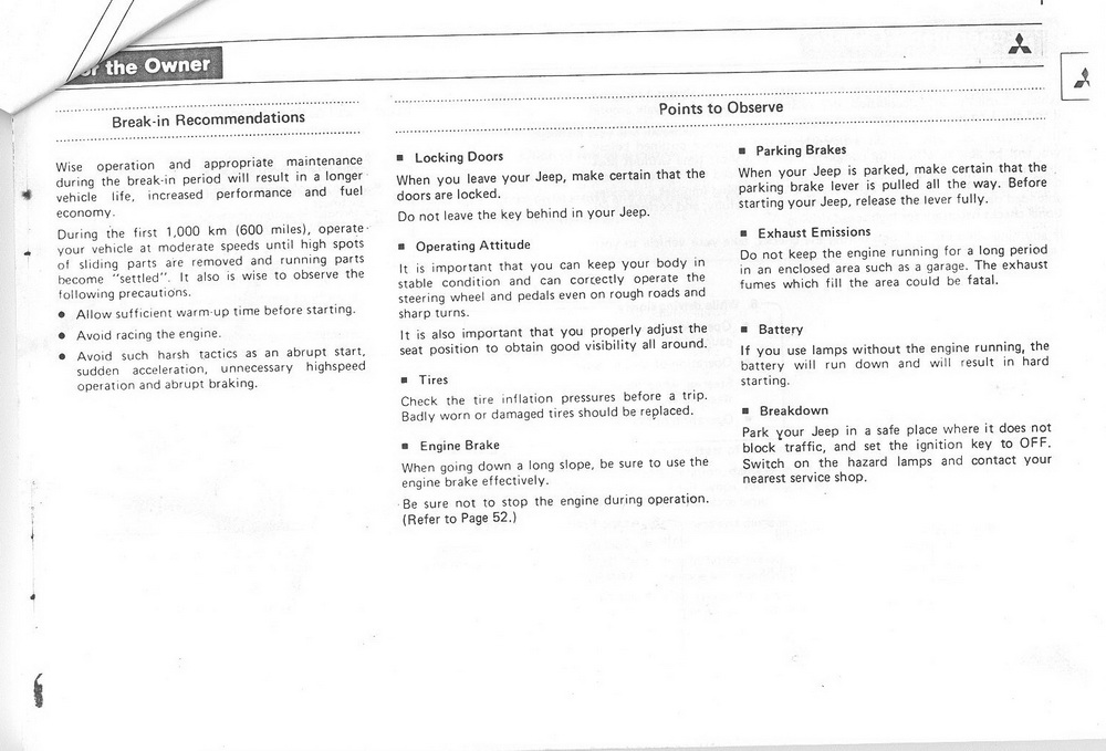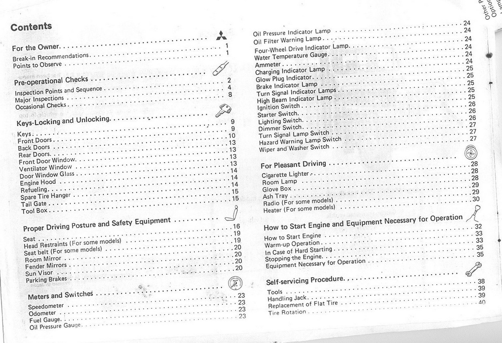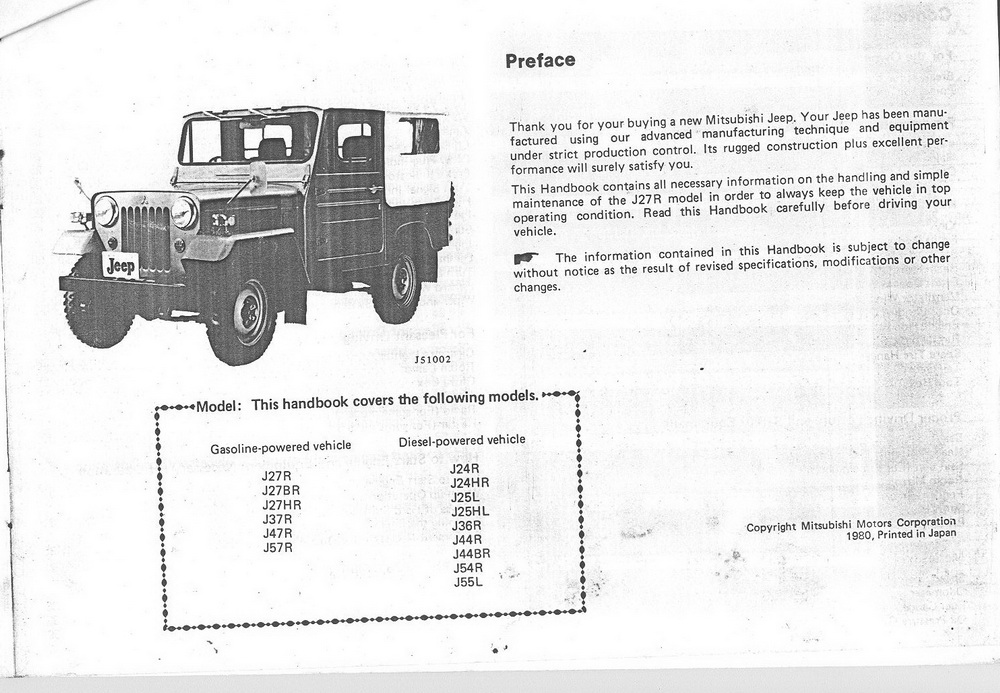 ด้วยความรักที่มีต่อรถJEEP MITSU หรือMITSUBISHI JEEP ที่เรารักก็อยากให้เป็นประโยชน์กับผู้ที่สนใจเริ่มเรียนรู้ได้ศึกษา เริ่มมีรถและใช้รถจิ๊ปที่เรารักอย่างถูกต้องจึงมีความจำเป็นที่จะต้องศึกษาใคร่รู้ให้เข้าใจก่อนในอุปกรณ์ต่างๆที่มีอยู่ในรถจิ๊ปมิตซูฯ รอบรู้ในรุ่นต่างๆของรถรวมถึงการใช้งานที่ถูกต้องของจิ๊ปมิตซูฯ เพื่อให้เกิดประโยชน์สูงสุดกับเรา ผมเองก็ทิ้งไปซะนานเลยค้นข้อมูลเก่าๆที่มีอยู่ก็พอมีให้เป็นประโยชน์กับผู้ที่สนใจได้บ้างขอเริ่มด้วย MITSUBISHI MANUAL JEEP เลยครับ ทั้งหมดมี 60 หน้าครับ