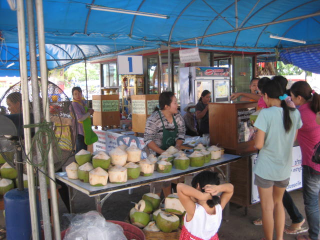 สุดท้ายก็เอาอย่างคนไทยย่อนตังค์ลงในตู้ แล้วก็ไปรอรับมะพร้าวคนละลูก