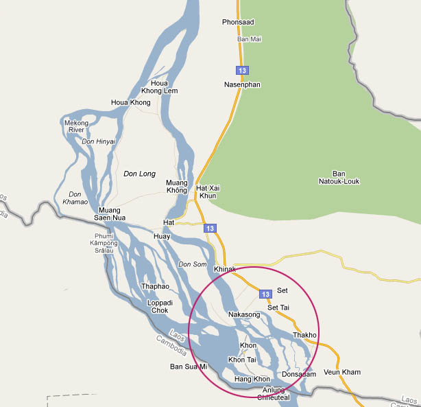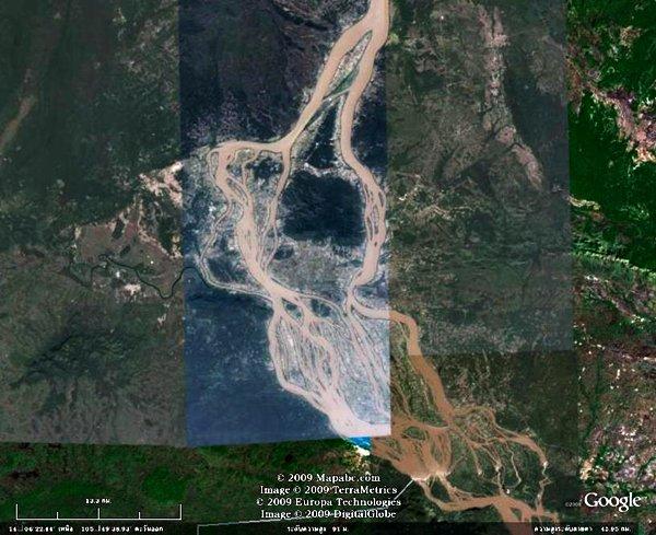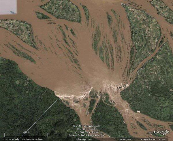 ภาพจากGoogle Earth ด้วยสภาพภูมิศาสตร์ที่พื้นด้านใต้เกิดจากหินแข็ง และความสูงต่ำของพื้นแผ่นดินที่แตกต่างกัน แม่น้ำจึงเกิดแตกแขนง แผ่กว้าง แล้วไหลรวมตัว พุ่งกระโจนเป็นน้ำตก...เป็นแก่ง เป็นดอนมากมาย