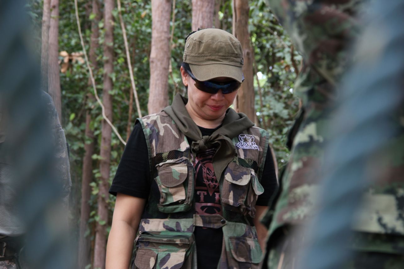 ในที่สุดก็มายืนเเรียงแถวรับฟังครูฝึกอธิบายวิธีการไต่ตาข่าย..แต่มักจะหลบๆ ไปยืนอยู่ด้านหลัง