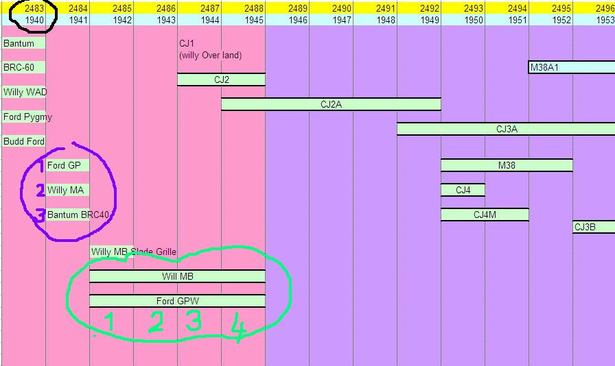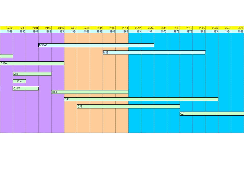 เราลองมาย้อนเวลากันหน่อยว่าจี๊ปนั้นถือกำเนิดมากันตั้งแต่ปีใหน รุ่นอะไร ระยะเวลาใกรผลิตออกมาสู่สนามรบ หรือบนถนน นั้นยาวนานเพียงใด ช่วงใหนมีสงครามอะไรบ้าง