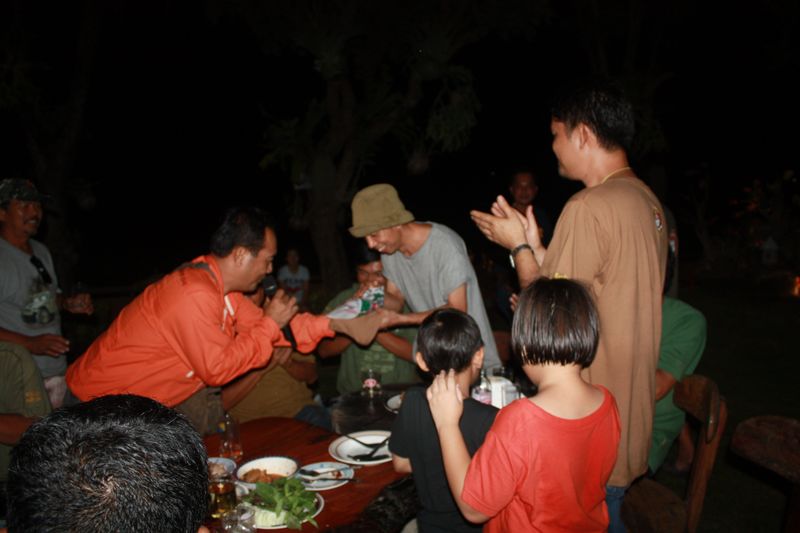 วันนั้นมี ดีเจ ทั้งโปรแกรม คาราโอเกะ ต้องยกให้หมอหลอง..เพลงมีทั้งเก่าและใหม่..อัฟเดด..ตลอดเวลา..แต่เห็นไม่ค่อยกินเหล้าเท่าไหร่ คงเหน็จเหนื่อยจากการเดินทางไกล..ประกอบกับจะต้องเดินทางไปเที่ยวต่อมุกดาหาร..หาสาว...แอ๋มของอ้าย .ขายเฟอ.อยู่มุกดาหาร..สองเฮาพบกัน..ที่ตลาดชื่ออินโดจีน..อ้ายคนพลัดบ้าน....