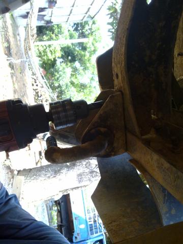 ปรากฎว่า มีน๊อตยึดแค่ตัวเดียวแถมถอยออกมาตั้งหลายเกลียว อีกด้านนึงมีเชื่อมแต้มใว้นิดหน่อยและหลุดเรียบร้อยแล้ว(ภาพนี้ คลายออกมานิดนึงเพื่อให้เห็น จะ จะ)