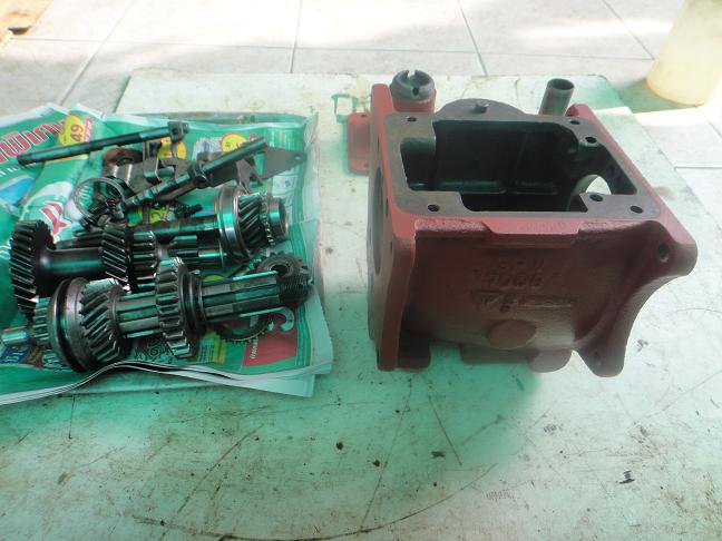 ผมเริ่มด้วยการใส่เฟือเกียร์ถอยหลังก่อน ตรวจสอบสภาพฟันเฟือง และบุช ถ้าไม่มีบิ่นหรือ บุชสึกมาก็ประกอบได้เลย ใส่เพลาเฟืองถอยหลังเข้าไปโดยให้ด้านที่มีร่องอยู่ด้านนอก โดยทาจารบีที่เพลาเล็กน้อย