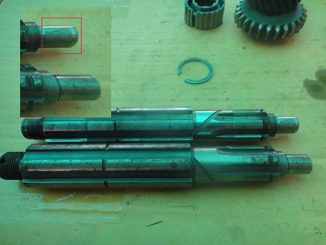 ต่อไปประกอบชุดเกียร์ 2 และ 3 ก่อนอื่น ตรวจสอบสภาพเพลาเกียร์ ของผมคงต้องเปลี่ยนเพราะที่ปลายเพลา สึกหรอมาก มีรอยกัดของเม็ดลูกปืน ( จากภาพเปรียบเทียบเพลาเก่า อันบน กับเพลาใหม่ อันล่าง)