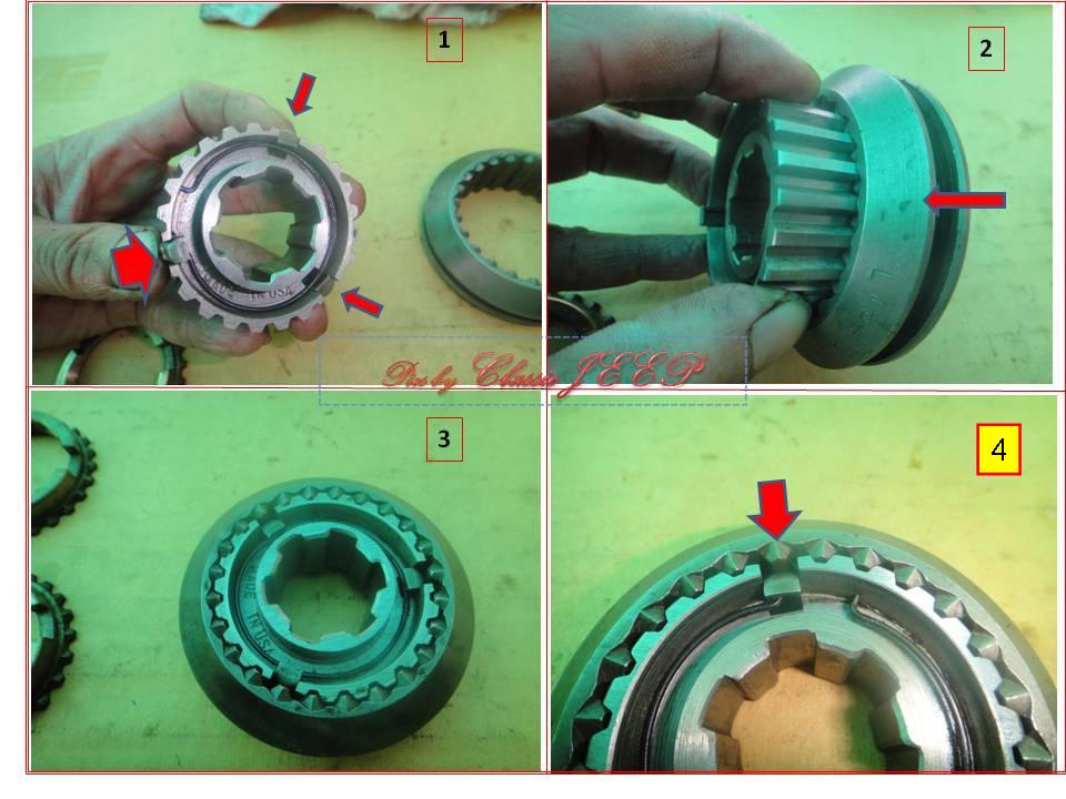 ประกอบชุด Synchronize เข้าไปโดยหันเอาด้านที่มีบ่ายาวออกด้านนอก ตามลูกศร ทั้ง2ด้านจะยาวไม่เท่ากันหากใส่กลับด้าน งานจะเข้าเพราะเฟืองทองเหลืองจะเข้าไม่่ถึงเฟืองเกียร์ 2 ครับ