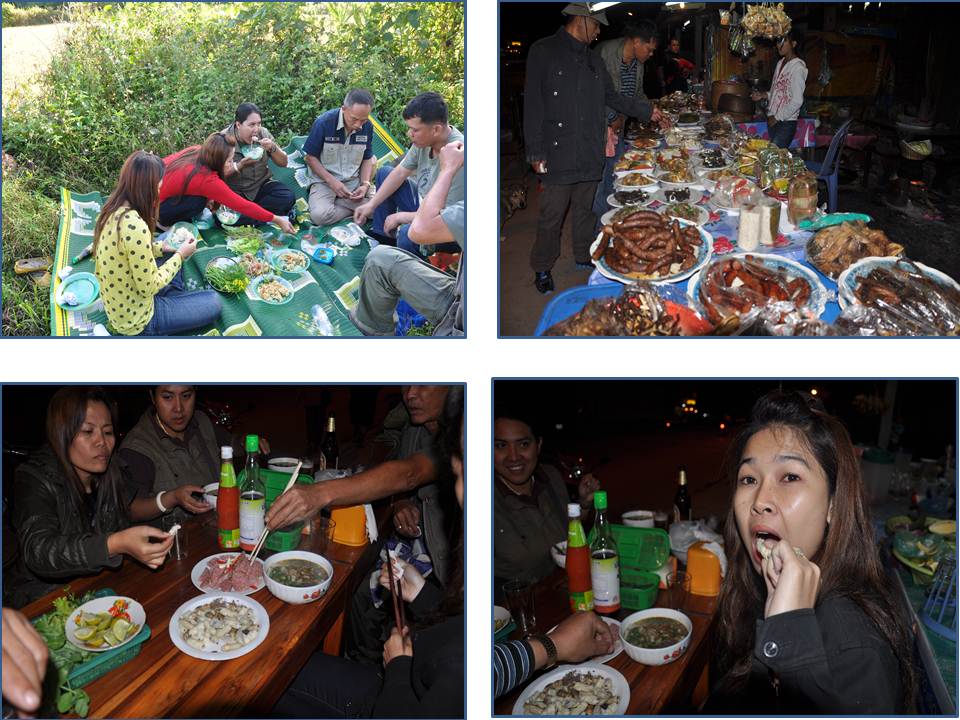 อาหารที่ตลาดพื้นบ้านไม่แพง สิ่งที่ต้องนำไปจากประเทศไทย คือ พริกแกง(ไม่มีขาย) อาหารที่น่าซื้อมาประกอบอาหารทำกินเอง คือ ไก่บ้าน(ไม่มีไก่พันธ์) หมูจี่(ไม่ค่อยมีมัน) ปลาธรรมชาติ(เกือบทั่วทุกที่ตามเส้นทาง จะมีลำน้ำตลอด(แบตเตอรรี๋อาเซียน)