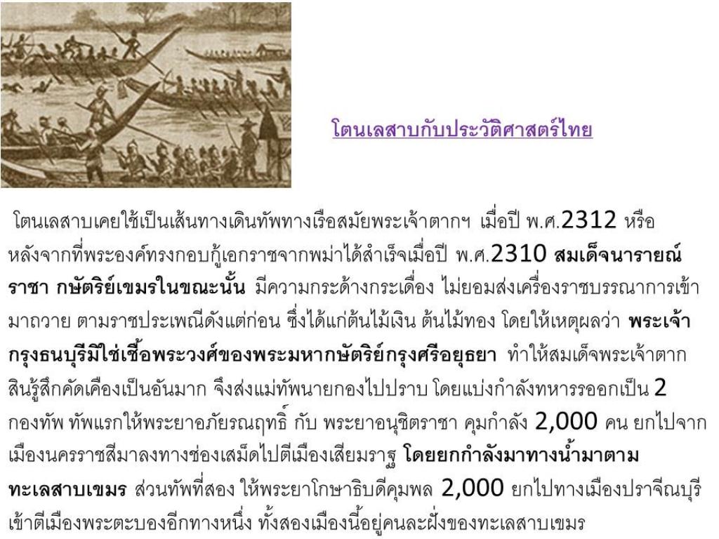 ทะเสาบ(น้ำจืด)ที่ใหญ่ที่สุดในเอเชีย.โตนเล ในภาษาเขมร หมายถึง แม่น้ำ สาบ หมายถึง จืด ทะเลสาบน้ำจืดที่ใหญ่ที่สุดในเอเชียแห่งนี้ ใหญ่กว่ากรุงเทพฯ ประมาณ 7 เท่า เกิดจากแม่น้ำโขงเป็นแหล่งอาหารน้ำจืดที่ใหญ่ที่สุดในโลกและสร้างรายได้ให้กับประเทศเป็นอันดับ 2 รองจากการท่องเที่ยว ซึ่งแม่น้ำโขงไหลผ่านมีความยาวถึง 500 กิโลเมตร ครอบคลุมพื้นที่ 5 จังหวัดของ สายน้ำโขงที่ไหลหลากเรื่อยมาจากดินแดนหลังคาโลก นำความอุดมสมบูรณ์มาสู่โตนเลสาบ ลุ่มน้ำอันเปรียบดั่ง อู่ข้าวอู่น้ำ ที่หล่อเลี้ยงชีวิตของชาวกัมพูชา การสร้างเขื่อนขนาดใหญ่นับสิบๆแห่ง ทั้งในประเทศจีนมาและประเทศเวียดนาม ที่อยู่ทางตอนเหนือของแม่น้ำโขง ทำให้กระแสน้ำสายหลักหรือแม่น้ำโขงที่ไหลลงทะเลสาบลดน้อยกว่าปกติ และไม่เป็นไปตามธรรมชาติ