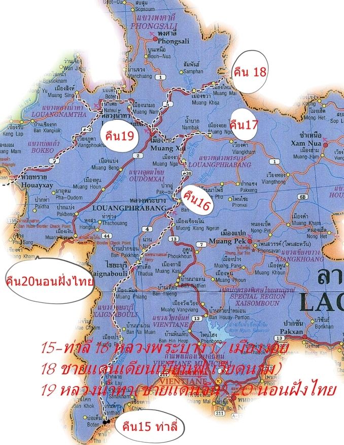 1 ท่าลี่ จ.เลย 16 นอนหลวงพระบาง 17 ไปเมืองงอย 120 กม.(ถึงหมู่บ้านไม่น่าเกิน 170 กม) แจกของตอนมีกิจกรรมกลางคืนเลย เช้า 18 หลังอาหารเช้าไปอุดมไชย เลี้ยวขวาขึ้นไปพงสาลีที่ชายแดนเวียดนาม(เดียนเบียฟู พักค้างคืน) 19 เช้าย้อนกลับมาอุดมไชย ไปด่านบ่อเต็น-มัวฮาน(ชายแดนจีน)นอนหลวงน้ำทา 20 เช้าไปเมืองสิง(ได้ข้อมูลว่าไม่ค่อยมีอะไรมาก แจกของเสร็จ เดินทางกลับมาหลวงน้ำทา-เวียงภูคา-ห้วยทราย(แขวงบ่อแก้ว)-ข้ามสะพานเข้าไทยประมาณ 15.30-16.00 น.
