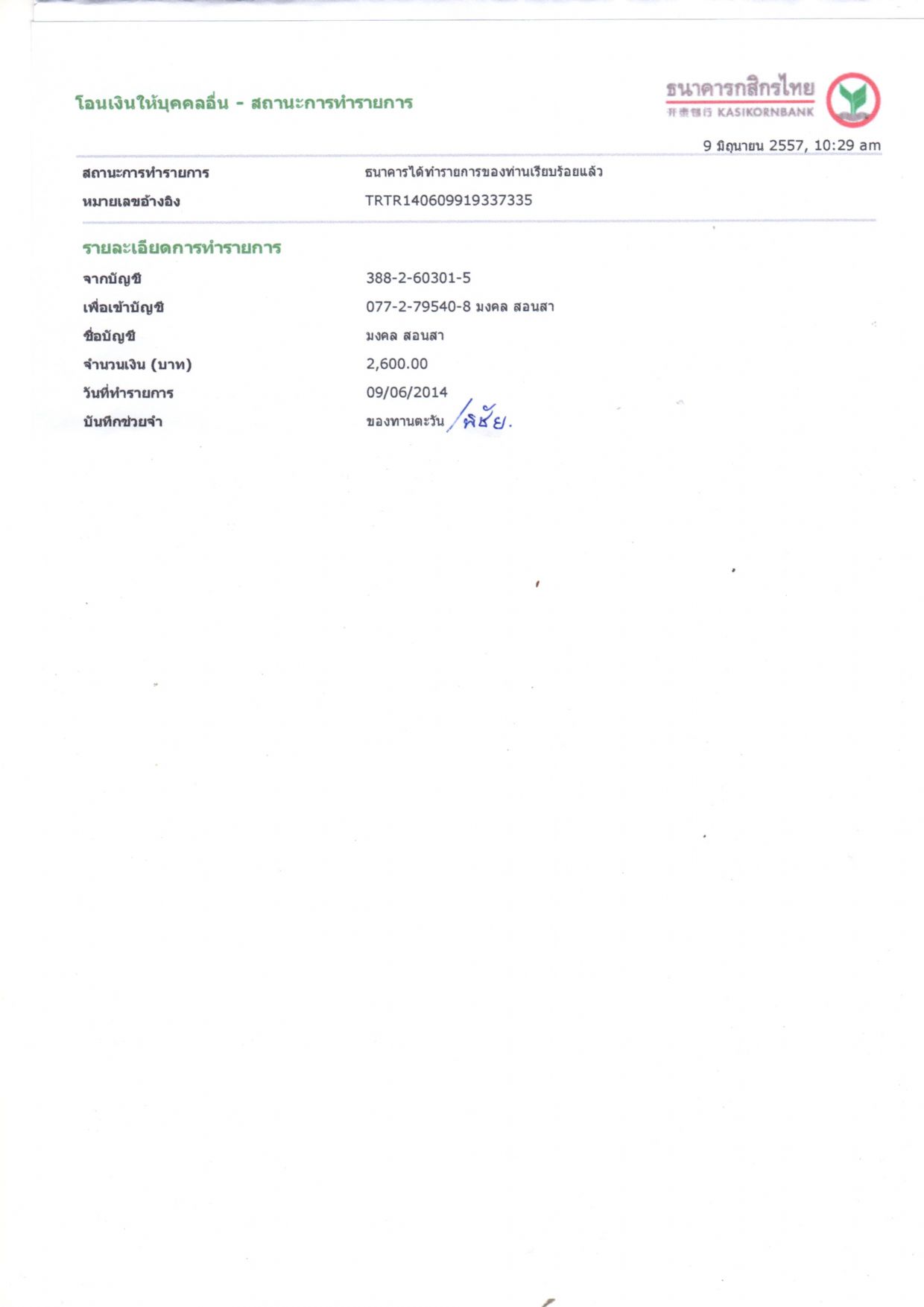 โอนให้แล้วครับ 2,600 บาท พิชัย รักษ์ยศ