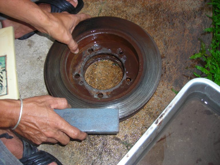 ออกมาแล้วก็ขัดสนิมออกเสียหน่อย เพื่อนบอกว่าถ้ามันเบรกอยู่ ดิสเบรกน่าจะมีความวาวจากการเบรกมากกว่านี้