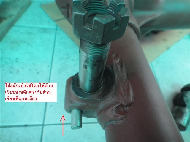 จากนั้นใส่สลักเข้าไปในรูแกนเลี้ยว โดยให้ด้านเรียบตรงกัน