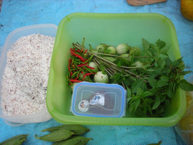 มะเขือเปราะ ใบโหระพา พริกแกงเขียวหวาน มะพร้าวขูด