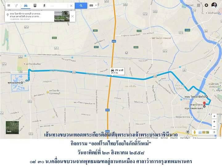 7:30 น. ออกเดินทาง เส้นทาง พุทธมณฑล เข้าสู่ ถนนบรมราชชนี ข้ามสะพานพระปิ่นเกล้า ถนนราชดำเนิน อนุเสวารีย์ประชาธิปไตย ถนนราชดำเนิน
