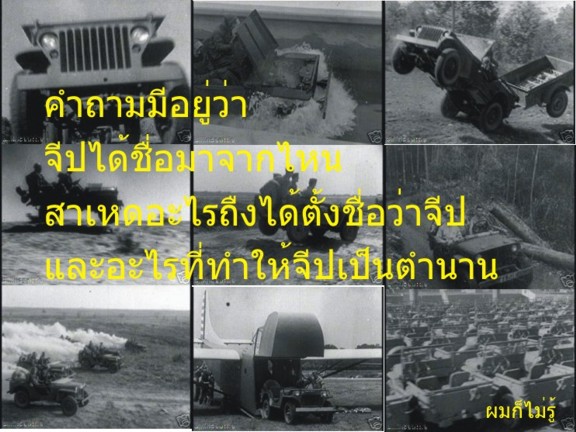 เอาตามความเข้าใจแบบพาสาคนทุ้ง คือในช่วงแลกทั้งสามบริษัด คือบันตัม ฟอร์ด และวีลลี่ แข่งขันกันส้างแบบรถขับสื่ในช่วงนั้น แต่วีลลี่ชะนะต้นแบบไปคือรหัส เอ็มบี MB และฟอร์ดได้ส่วนแบ่งไปผะลิดด้วย แต่ฟอร์ดยังใช้ชื่อรหัสรุ่นเดีมของตัวเองคือ จีพี GP แต่มี ดัฟยู w ห้อยท้ายมา และความหมายของรหัส GPW ก็คือ GPเป็นรหัสทางการผลิตรถของฟอร์ด ส่วน W ดัฟยูก็คือ Willys copy model ก็อบแบบวีลลี่ เอ็มบี นั้นเอง ส่วนชื่อจีปได้มายังไงไม้มีไครรู้แน่ชัด แต่คาดเดาว่าส่วนหนื่งอาดพูดออกเสียงเพยี่นอย่างรวดเร็ว ละหว่าง GP กายเป็น Jeep นั้นเอง... ดั่งนั้นหลังสงคามโลกไม่ว่าบริษัดใหญ่ในยี่ปุ่น หลืยุโรบ และเมืองผู้ดีต่างก็นำต้นแบบของจีป ไปพัฌนาทำรุ่นต่างๆเพื่อออกขาย, แต่ยังคงใช่คำว่าจืป นำหน้าอยู่สะเหมีมาแหละนั้นคือตำนานของคำว่า "Jeep"