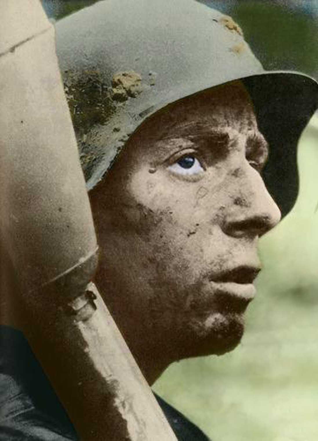 ดูสายตาอันหวาดกลัวของทะหารนาชีคนนี้ จ้องขื้นแต่ข้างบน สะแดงว่าคอยละวัง และมองหาเครื่องบินของฝ่ายพันธมิตร