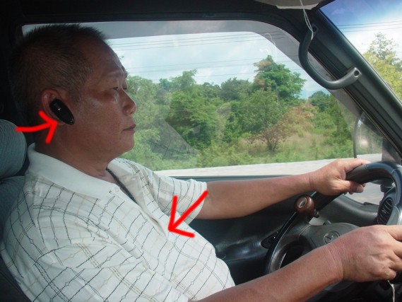 แต่ผมก็อุ่นใจเพาะมี “ โชเฟี้ “ (คนขับ)รถของผมเชื้อใจได้ เพาะแกละวังและป้องกันไว้อย่างเต็มที่ ขะหนาดกฏหมายพืงออกมาใหม่ๆยังไม่ทันแห้ง “ ห้ามโทรเวลาขัข” แก่ก็ใส่หูฟังเป็นที่เรียบร้อย...เอี..แต่ว่าลืมใส่เข็มขัดครับ...เอ๋ยังงัยเนีย..