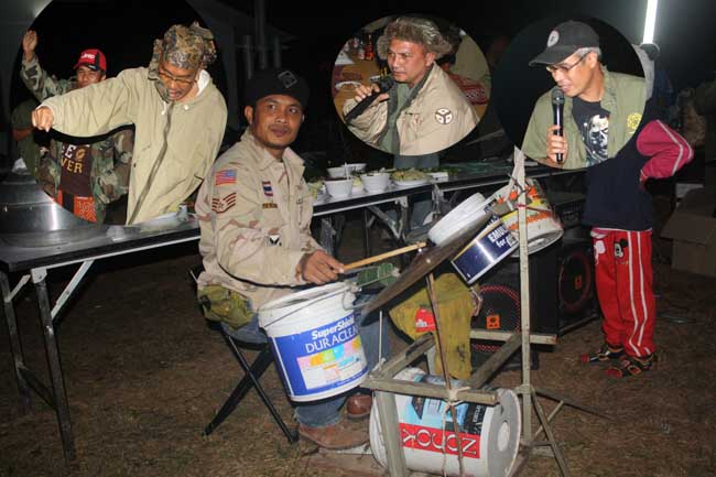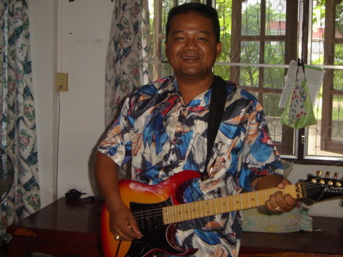 มือกีต้าร์ ก็พร้อมแล้วครับ โปรดสังเกตุดูที่คอ นักร้องนะครับ พวงมาลัยจากแม่ยก ได้มาจากศาลพระภูมิ ข้างทาง... คณะวงดลตรีของเราคณะนี้ ชื่อวงว่า ..ร๊อคอะหย่ะ...ทำการแสดงที่ไหนไม่ไล่ไม่เลิก ....ค้าจ้างแล้วแต่เจ้าภาพจะพิจรณา ...