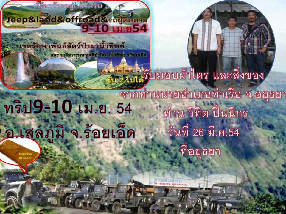 ทริป ..บำเพ็ญประโยชน์ท่องเที่ยวเชิงอนุรักษ์ 9-10 เม.ย.54 ที่เขตรักษาพันธุ์สัตว์ป่าผาน้ำทิพย์ อ.หนองพอก จ.ร้อยเอ็ด(งานนี้ร่วมงานบวช นายตุ๋ย4x4 เด็กเสฯ..(เสลภูมิ) ด้วย ในวันที่ 9 เมษายน 54 และ ยินดีด้วยที่ได้รับมอบผ้าไตรจีวร จากท่านนายอำเภอท่าเรือ จ.อยุธยา ท่าน วิทิต ปิ่นนิกร แล้วยังมอบ ข้าวของเครื่องใช้ และอาหารแห้งไว้สำหรับ มอบในทริปร้อยเอ็ด ด้วย)