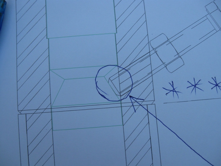 ดูใกล้ ๆ ครับ...ตรงนี้แหละที่สำคัญที่สุด....เพราะต้องใช้วิชาคำนวนที่แม่นยำที่สุด...เพื่อให้ปลายน็อตหางปลาลงมาสนิทกับสโล็บของเดือยให้พอดีกัน จึงจะล็อคแท่นรองรับปืนกลไม่ให้หมุน...(คงเข้าใจกันแล้วนะคับ)