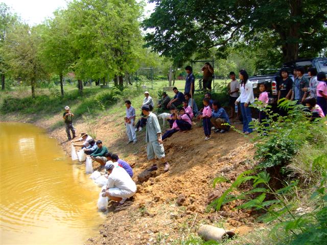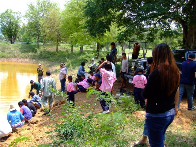 ปล่อยพันธุ์ปลาหลายร้อยตัวกับท่านอื่นๆลงสระน้ำในโรงเรียน