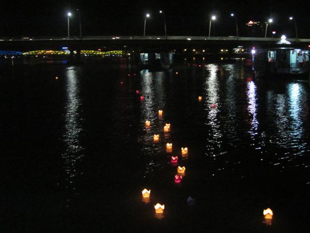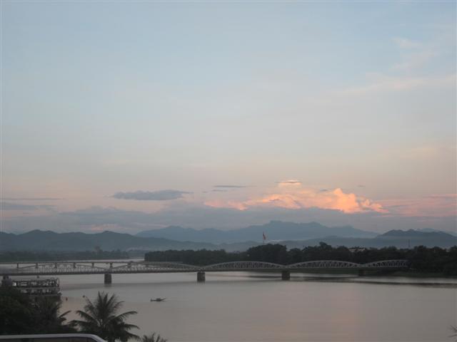 รุ่งอรุนวันใหม่ ณ ริมฝั่งแม่น้ำหอม ที่ทองเห็นธงลิบๆด้านขวามือคือพระราชวังโบราณ