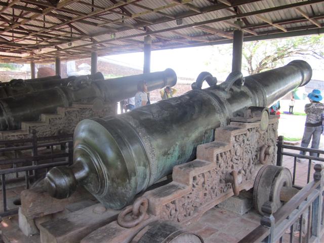 เข้ามาก็เจอปืนใหญ่ ประตูซ้าย 4 กระบอก ประตูขวา 5 กระบอก ทั้ง 9 กระบอกยิงไม่ได้ และไม่เคยยิง จากประวัติบอกใว้ว่า พระเจ้ายาลอง ยกพลมาสวามิภักดิ์กรุงสยาม เตรียมไพร่พลพร้อมรบยกไปปราบกบฏ เมื่อสำเร็จได้ครองเมือง ยึดหอกดาบอาวุธต่างๆมาเพื่อไม่ให้กำเริบเสิบสาน มาหลอมรวมกันเป็นปืนใหญ่ โดยช่างจากกรุงสยาม ตั้งใว้เป็นสัญญาลักษณ์ ข่มขู่ศัตรู เท่านั้นเอง