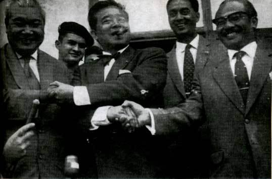 จากซ้ายเจ้าสุวรรณภูมา (ฝ่ายเป็นกลาง) เจ้าบุญอุ้ม ณ จำปาศักดิ์ (คนสูบซิการ์ – ฝ่ายขวา) และขวาสุด เจ้าสุภานุวงศ์ (ฝ่ายซ้าย)ร่วมกันจัดตั้งรัฐบาลผสม ๓ ฝ่าย (จะไม่ขอกล่าวถึงเรื่องสงครามลับในลาว)