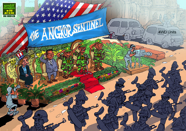 สหรัฐฯนั้น นับตั้งแต่ปี 2006 ได้จัดหาจัดส่งยุทโธปกรณ์และจัดการฝึกอบรมทางทหารให้แก่กองทัพกัมพูชาคิดเป็นมูลค่ากว่า 4.5 ล้านดอลลาร์ และครั้งนี้ก็เป็นครั้งแรกที่ทั้งสองฝ่ายได้ร่วมกันนำเอายุทโธปกรณ์เหล่านี้มาใช้งาน น่าสังเกตด้วยว่าในระยะหลังๆ มานี้ พวกเจ้าหน้าที่สหรัฐฯได้มีการแถลงแสดงท่าทีที่มุ่งตอกย้ำความร่วมมือระหว่างฝ่ายทหารกัมพูชากับฝ่ายทหารสหรัฐฯอยู่หลายครั้งหลายครา เมื่อวันที่ 3 พฤษภาคม ในพิธีเปิดศูนย์ฝึกอบรมกองกำลังรักษาสันติภาพ (Peacekeeping Training Center) ซึ่งได้รับเงินทุนสนับสนุนจากกระทรวงกลาโหมสหรัฐฯ ธีโอดอร์ แอลเลกรา (Theodore Allegra) อุปทูตของสหรัฐฯกล่าวสุนทรพจน์ว่า สหรัฐฯยังคง มีความมุ่งมั่นผูกพันที่จะส่งเสริมความสัมพันธ์ทางทหารกับกัมพูชา ทั้งในด้านการปฏิรูปการป้องกันประเทศ และกระบวนการไปสู่ความเป็นทหารอาชีพ, ความมั่นคงทางด้านชายแดนและทางทะเล, การต่อสู้เอาชนะการก่อการร้าย, การปฏิบัติการผสมพลเรือน-ทหาร, และการกู้กับระเบิด ศูนย์ฝึกอบรมมูลค่า 1.8 ล้านดอลลาร์แห่งนี้ คือ หลักฐานซึ่งแสดงถึงความมุ่งมั่นผูกพันของรัฐบาลสหรัฐฯ ในอันที่จะส่งเสริมสนับสนุนศักยภาพแห่งความเป็นหุ้นส่วนกันกับทางฝ่ายกัมพูชา อุปทูตผู้นี้ระบุ ส่วนในพิธีเปิดการฝึกซ้อมทางทหารแบบพหุภาคีเมื่อวันที่ 12 กรกฎาคม แครอล ร็อดลีย์ (Carol Rodley) เอกอัครราชทูตสหรัฐฯประจำกัมพูชา กล่าวย้ำเช่นกันว่า วอชิงตันนั้นมีความมุ่งมั่นผูกพันต่อการส่งเสริมความสัมพันธ์ทางการทหารกับพนมเปญ เธอยังพูดถึงการฝึกร่วม อังกอร์ เซนทิเนล ว่า เป็น โอกาสอันพิเศษโดดเด่น สำหรับการเพิ่มขยายความเป็นมิตรระหว่างประเทศทั้งสอง