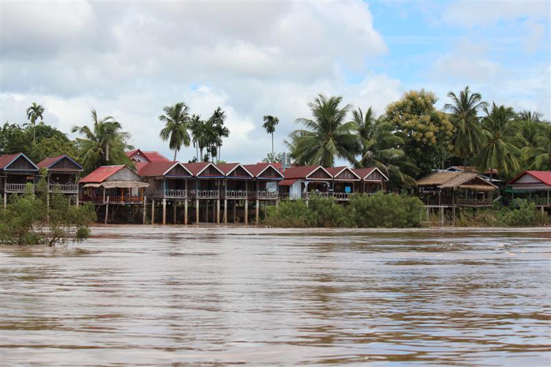 สังเกตเสาบ้าน จะเห็นรอยคราบระดับน้ำโขงเวลาขึ้นสูงสุด.